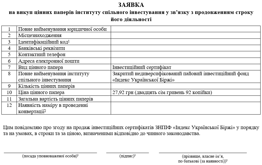 1.1. підписання та подання ПрАТ «КІНТО» заявки на викуп інвестиційних сертифікатів Фонду у зв’язку з продовженням строку його діяльності (далі – «Заявка»);